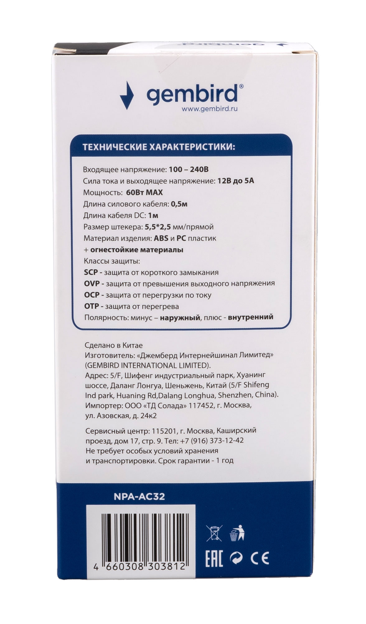 Размер штекера: 5,5*2,5 мм