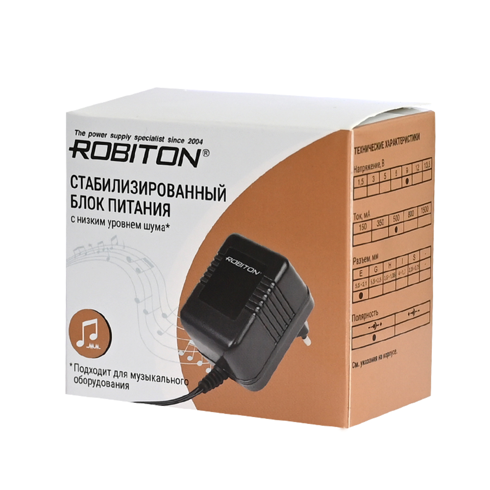 Блок питания 9В 0.5А трансформаторный стабилизированный с низким уровнем помех ROBITON AB9-500, штекер 5,5 х 2,1 / 12мм, отрицательная полярность [AB9-500]