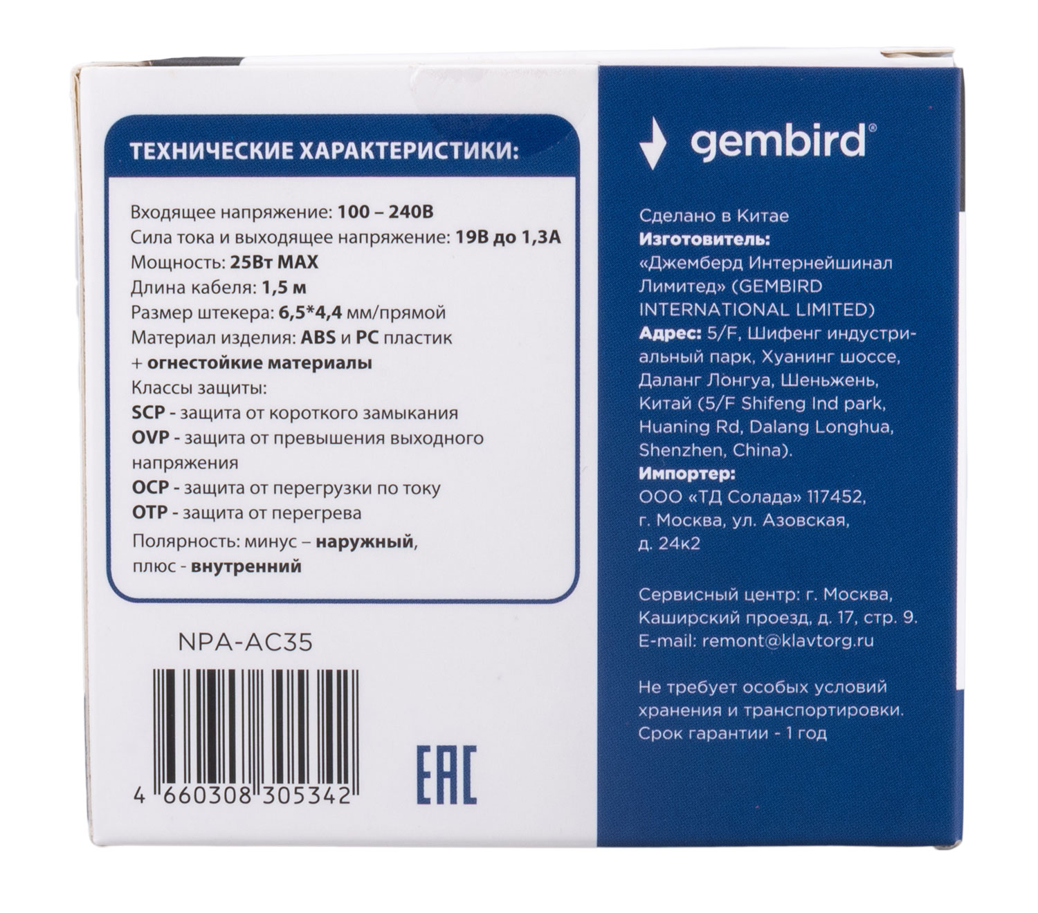 Длина кабеля: 1.5 м
