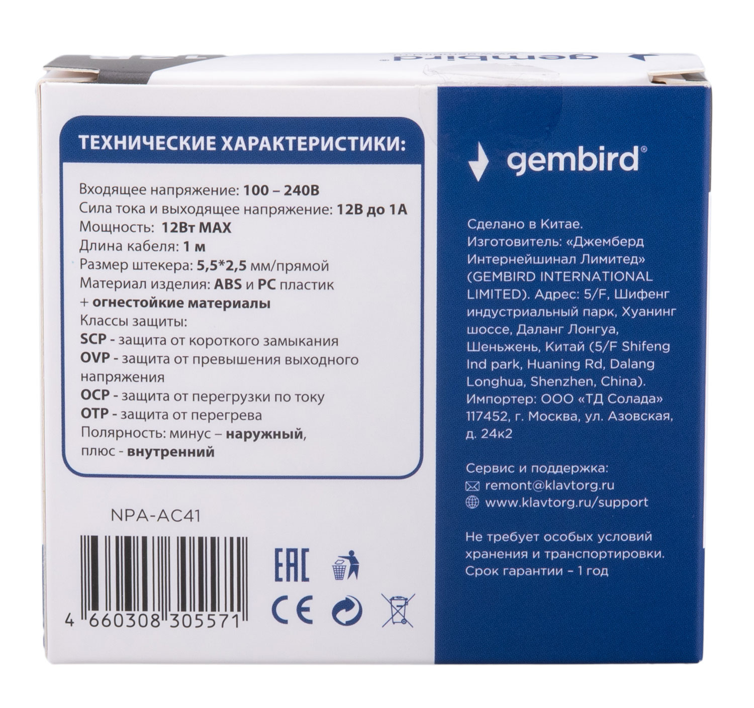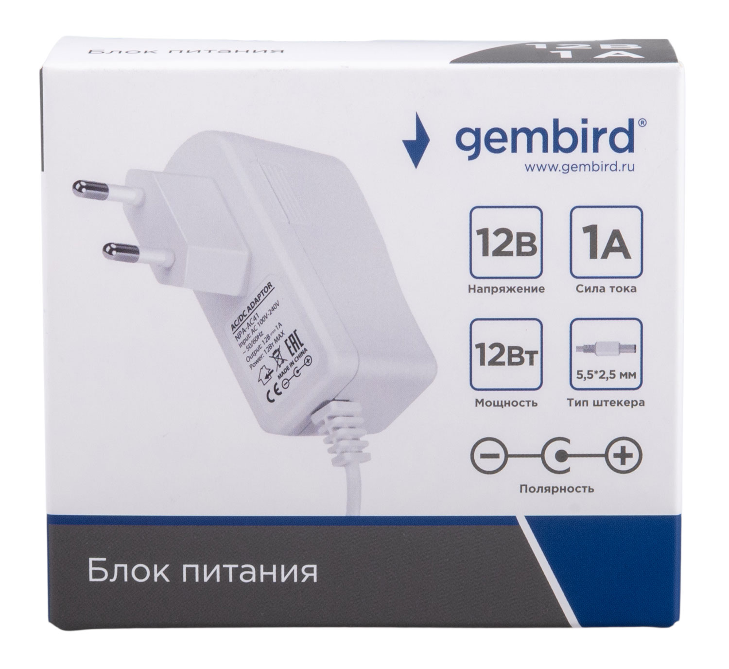 Блок питания 12В 1.0А стабилизированный, импульсный GEMBIRD NPA-AC41, белый, штекер 5,5х2,5мм [NPA-AC41]