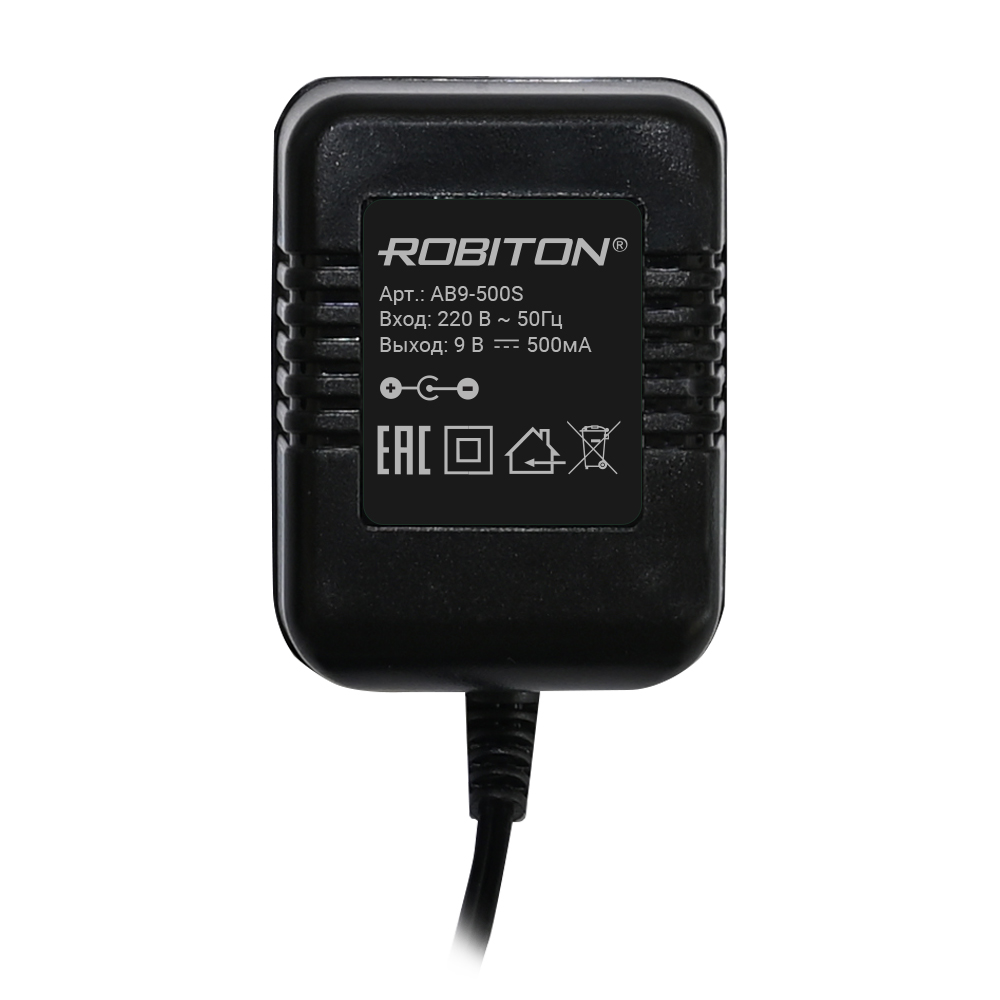 Блок питания 9В 0.5А трансформаторный стабилизированный с низким уровнем помех ROBITON AB9-500, штекер 5,5 х 2,1 / 12мм, отрицательная полярность [AB9-500]